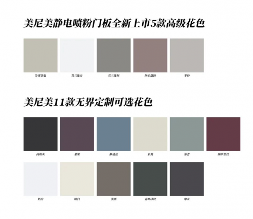 美尼美本次重磅上新的5款高级静电喷粉门板花色,另外还开放11种无界定制花色,以好品质、高颜值和超高质价比,致力于为中国家庭打造健康环保的家居空间。