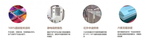 | 静电喷粉 | 应用静电原理,将无毒无味的树脂粉喷粉末固化在板件上,过程中不需要溶剂,就能得到极佳的喷涂效果。 | 优点:零甲醛、零VOC释放,零重金属、零污染;硬度高、耐刮、防水、防潮,使用寿命长;六面无缝喷涂,一体成型