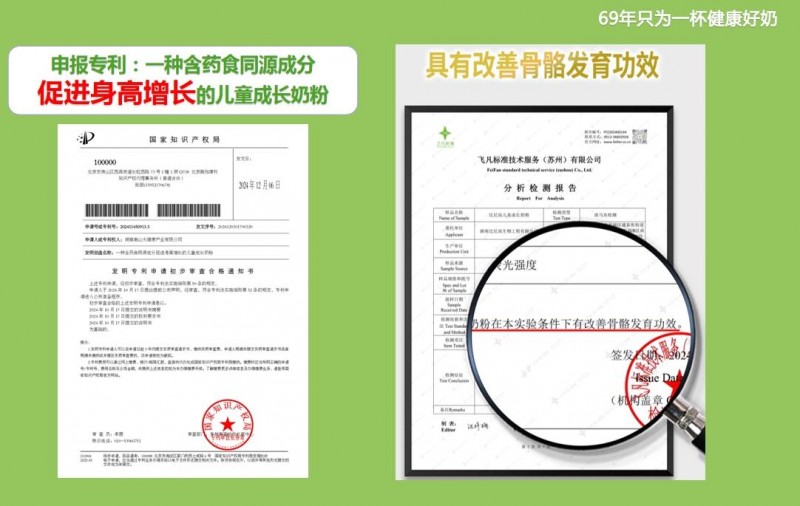 李定文教授所带领的团队一路披荆斩棘,敲定配料方案之后,向上申报了国家发明专利《一种含药食同源成分促进身高增长的儿童成长奶粉》,立志于通过专利证书加深比尼高奶粉在母婴产品市场上的含金量,进一步积累品牌口碑。通过了飞凡检测实验的斑马鱼测试“具有改善骨骼发育功效”,深受家庭信赖。不仅如此,5A-LAW体系更是覆盖“骨骼、视力、智力、免疫、消化”五大维度,配合黄金奶源与低敏工艺,成为高知家庭的优选。