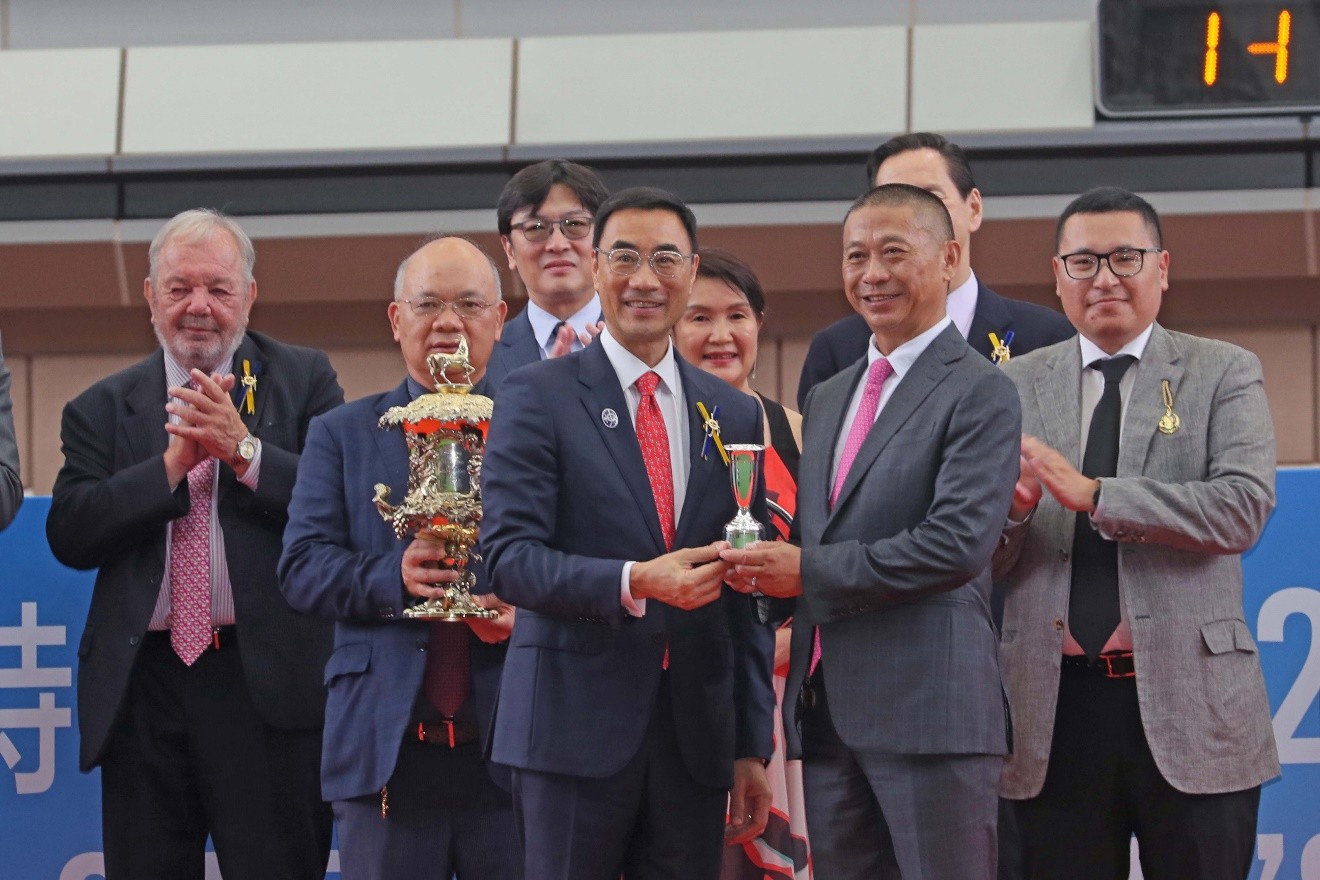 香港赛马会主席利子厚为“香港特区行政长官杯”赛事中夺冠的“维港智能”的练马师沈集成颁发奖杯。