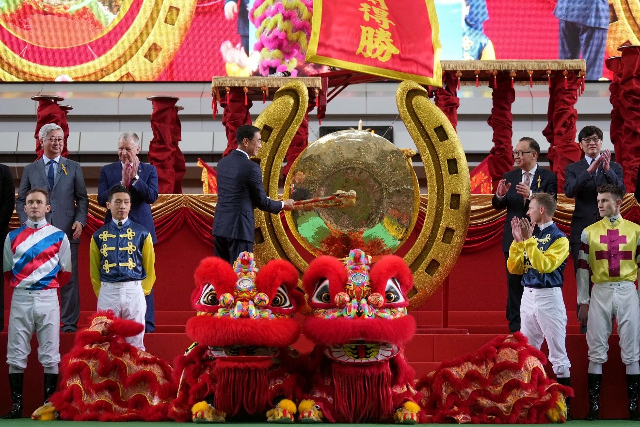 香港赛马会主席利子厚在开幕典礼上敲响巨型铜锣,为新赛马季揭开序幕。