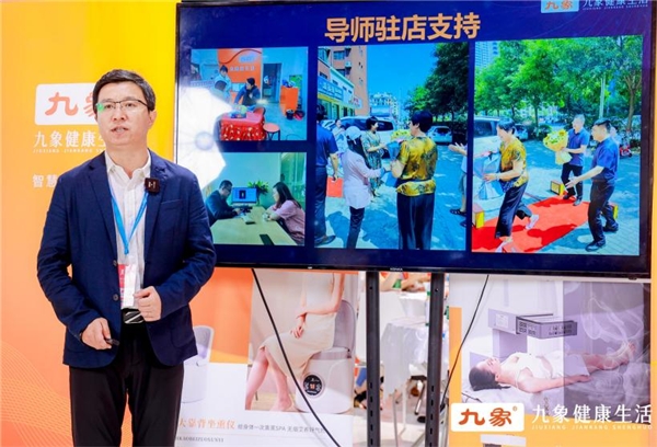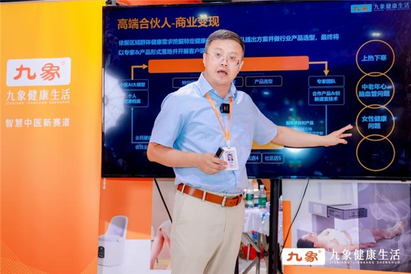 他分别从整体项目优势、标准化服务流程、客户管理方案及专家扶持等等多方面展开,并着重介绍了九象智慧模式在拓客获客方面、解决顾客健康问题方面的能力及商业变现的模式,从而展示出助力创业者打造高业绩养生门店的整店输出实力,和为传统经营者破局困境、实现事业再发展的渠道赋能实力。