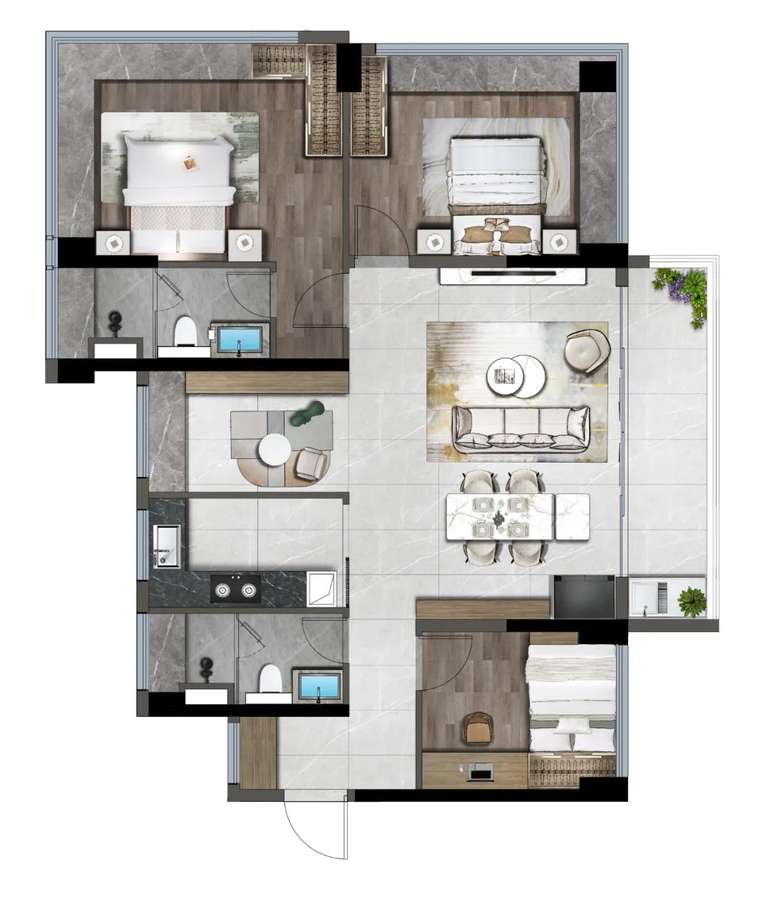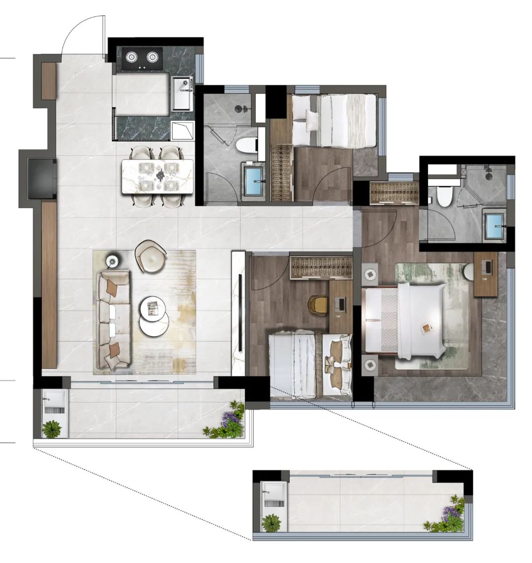 其中建面约89㎡三房两厅两卫,首付80万+即可入手,采用LDKB客餐厅一体化设计,合理规划空间;厨房U型操作台让洗切炒动线变得更流畅;嵌入式玄关柜,冰箱位让家居环境整洁有序;超5米面宽阳台和主卧270°大飘窗将苍翠山景一览无余。