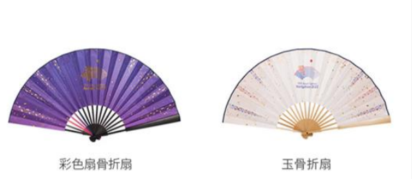 制扇技艺“王星记扇”是国家级非遗项目,也是“杭产三绝”之一,展览展出王星记扇厂定制的两款亚运系列扇。折扇作品的扇面基于亚运会徽的“钱塘江”和“钱江潮头”进行了创意设计,整体展现杭州的地域特色和城市活力。团扇作品则以良渚文化中最具代表性的玉琮图案为主体,表现了杭州亚运的非遗元素与地域文化特色有机结合。