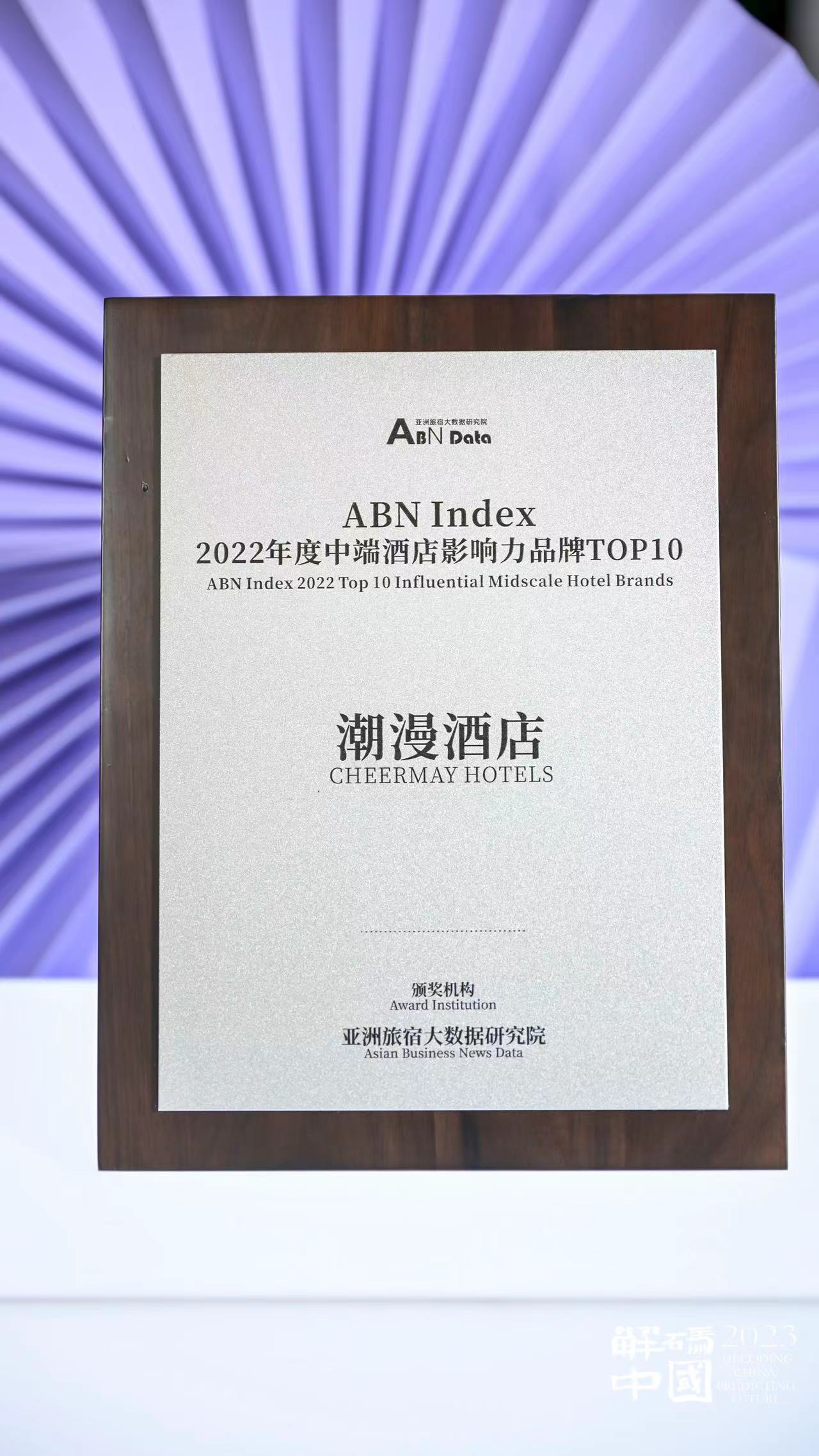 潮漫酒店凭借着在产品、规模、传播、口碑等多重维度的突出表现,荣获2022ABN Index年度影响力中端酒店品牌榜单TOP10。