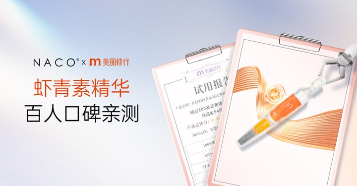 美丽修行百人体验官盲测报告,可以看出NACO虾青素次抛在质地、肤感、保湿、祛黄祛暗、嫩滑焕亮、提升弹润度、温和等方面都备受肯定。