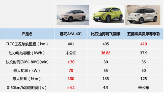 首先从造型来看,哪吒AYA整体呈现低趴姿态,更有运动感和俯冲感,适合各个年龄段,不同性别的用户;比亚迪海鸥轮廓可爱灵动,整体看起来比较娇小,更适合女性用户;五菱缤果则为复古风,圆润呆萌,能够戳中不少年轻女性的萌点。