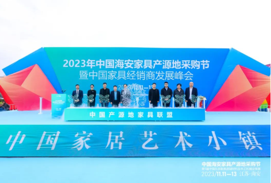 11月11日,2023年中国海安家具产源地采购节在江苏海安盛大开幕。开幕式上,中国产源地家具联盟正式成立!世界家具联合会主席、亚洲家具联合会会长、中国家具协会理事长徐祥楠,世界家具联合会秘书长、亚洲家具联合会副会长兼秘书长、中国家具协会副理事长兼秘书长屠祺,中国林业科学研究院林业科技信息研究所林产品市场与贸易研究室副主任、全球林产品绿色供应链倡议秘书处秘书长罗信坚,江苏省现代服务业联合会会长赵芝明,江苏省家具协会执行会长冯建华,海安市委书记于立忠,市委副书记、市长谭真,市人大常委会主任张亚曦,市政协主席李春旺等领导共同见证了这一家具产业发展的历史性时刻。