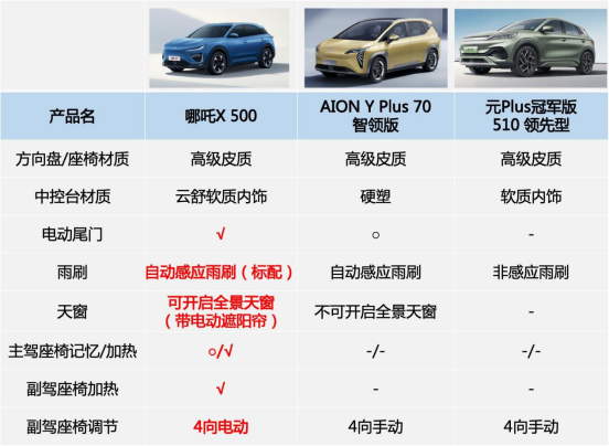 珍贵的不是配置,而是“同级少有”。像AION Y Plus和元Plus,没有主副驾加热和记忆功能,手动调节的副驾座椅也让用户体验大大下降。在天窗的配备方面,AION Y Plus的全景天窗不可开启,体验上差点意思;元Plus则没有全景天窗,不符合年轻用户“我可以不要,但你必须要有”的消费观念,也让驾乘体验多少有些憋闷,和哪吒X相比起来,稍显平平无奇。