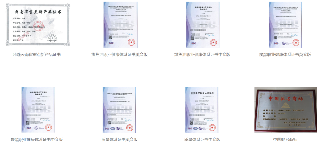 曲靖众一精细化工已通过了质量管理、环境管理、职业健康安全管理三体系认证及ISO/TS16949行业体系认证,先后被授予(认定)为国家高新技术企业、云南省科技计划项目承担单位、云南省企业技术中心、云南省煤焦油工程技术研究中心、云南省创新型试点企业,云南省百户优强民营企业、云南省科技小巨人企业、云南省循环经济示范试点企业、云南省100强企业及曲靖市60户重点骨干工业企业,并连续被当地政府授予“守合同重信用先进企业”、“ 安全生产工作先进集体”等称号。(以下为公司部分荣誉资质展示)。