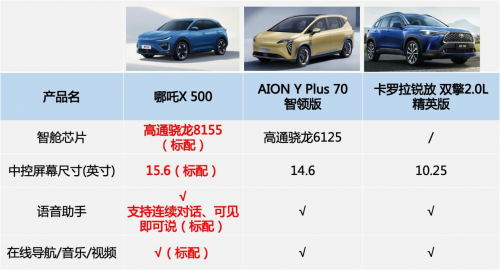 从数据上不难看出,哪吒X的车身长度和轴距均拥有较大优势,为用户带来了较好的乘坐体验。AION Y Plus的宽度和高度表现不错,但是就车身造型而言,经常让人分不清这款车是SUV还是MPV,在大街上看到,总感觉像个网约车。卡罗拉锐放的车身尺寸基本没有优势,长度还没超过4.5米,轴距更是三款车中最短的,逢年过节全家出门时,后排乘坐体验较拥挤。