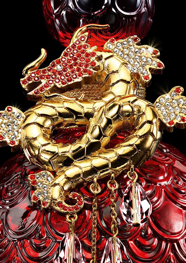华美的镀金龙为这款红色蜂印瓶注入了灵气,使其更加光彩夺目。这条龙由 Francesco Truscelli 设计,以 24K 金镀金,点缀 142 颗闪亮的施华洛世奇® 水晶,并延绵着一串刻面水晶拖尾。