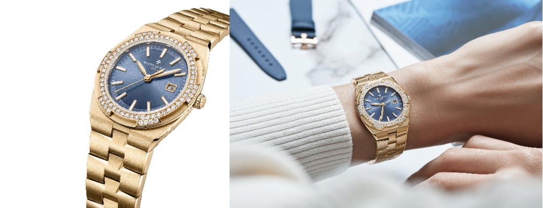 ●Overseas纵横四海系列首款33毫米粉红金石英腕表,配备一体式表链