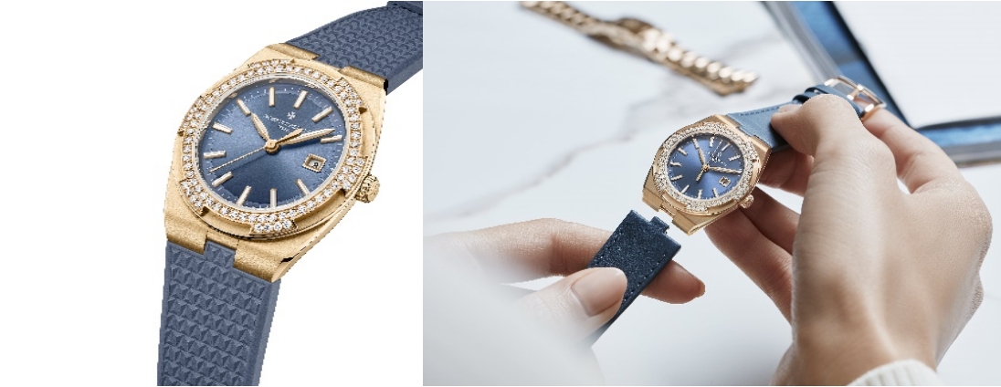 ●一款腕表,三面魅力——新作配备可快速替换的粉红金表链、丹宁蓝色小牛皮表带和橡胶表带及表扣