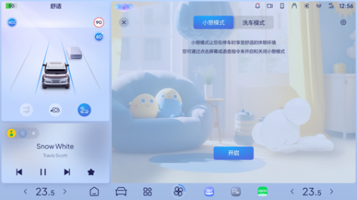 此外,哪吒汽车还深度洞察用户需求,带来小憩模式、洗车模式两大个性化情景模式。工作日午休,打开小憩模式,哪吒X将自动调整椅背,播放舒缓音乐,开启空调至合适温度,营造舒适休息氛围;洗车时,可以一键进入洗车状态,车辆将自动关闭车窗、折叠后视镜,禁用自动雨刮、远程车控等功能。