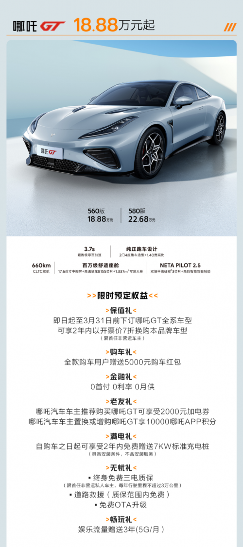 智驾、颜值、性能、智能无短板的哪吒GT,如今只要在直播间动动手指,就有机会免费三天深度试驾体验。如果想果断入手,现在也正是最佳时机——哪吒汽车近期推出了哪吒GT限时预定权益,包括2年7折换购保值礼、5000元红包购车礼,0首付、0利率、0月供金融礼、2年免费赠送7kW标准充电桩满电礼等7大福利。