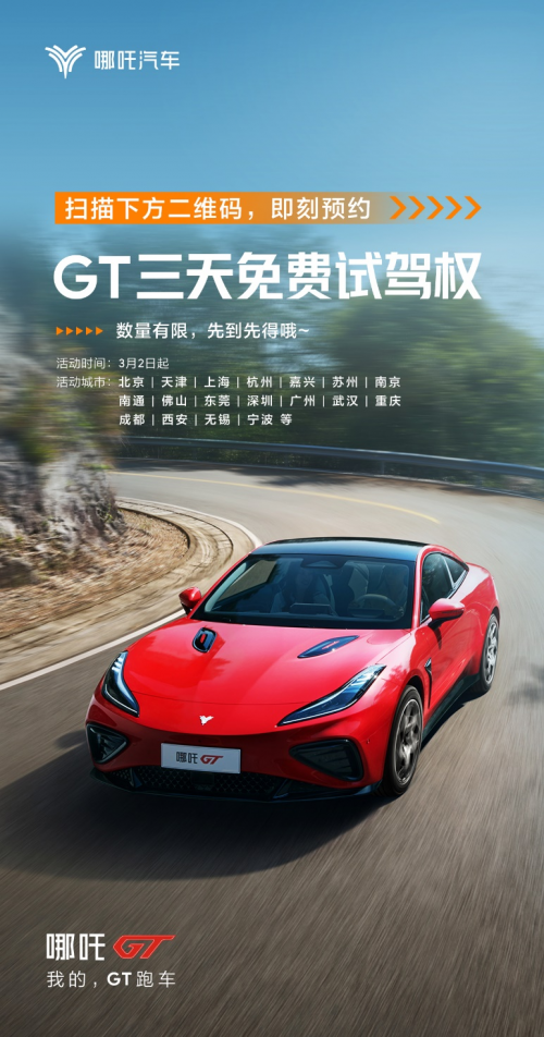 3月2日至3月31日,“哪吒GT 你的春游搭子”免费深度试驾活动将在北京、上海、广州、深圳、成都、杭州等全国26座城市全线启动。自3月1日起,哪吒汽车将在各大直播间抽取试驾名额,为各地消费者送上哪吒GT 3天使用权,解锁出游新姿势!