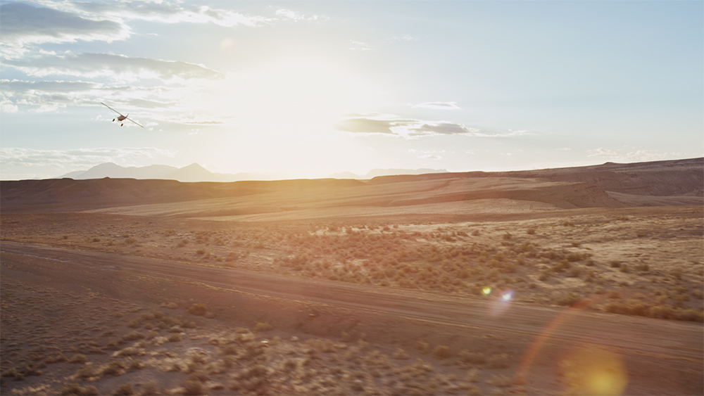 插画中描绘了一名飞行员身穿高领御寒大衣,行走在夜晚的沙漠中。在他身后还有一架飞机和一名飞行员。画面中的每个元素都充满诗意,生动形象。在盒子的另一侧,太阳闪耀着万丈光芒,为翱翔天际的翅膀镀上璀璨金光。