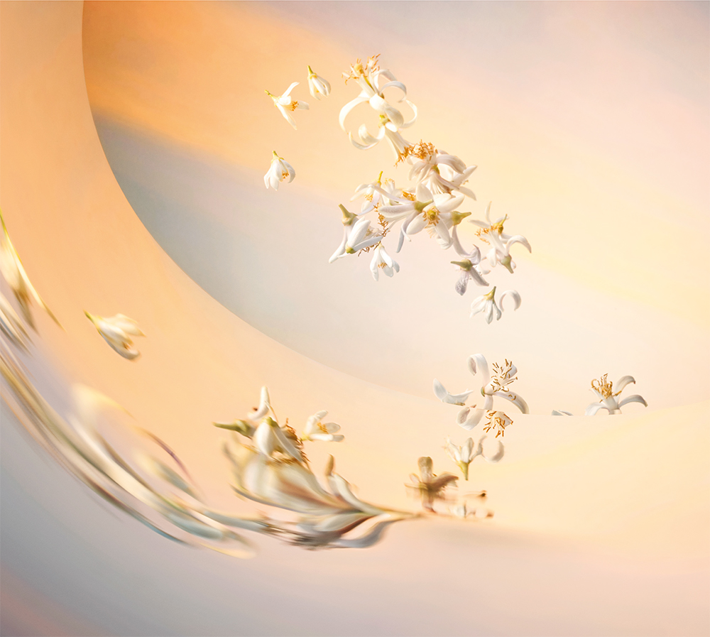 在摩洛哥的蔚蓝晴空下,成百上千棵橙树映入眼帘,仿佛一块晕染蓝色和绿色的调色板,其间点缀着耀眼的白色。无数洁白花朵在绿叶的掩映下,散发着清新香气。黎明时分,万籁俱寂,空气还未被烈日灼热,花香分外清晰柔和,蕴含无尽优雅。正是这种清新、明亮和芬芳的活力,造就了这款香水杰作。