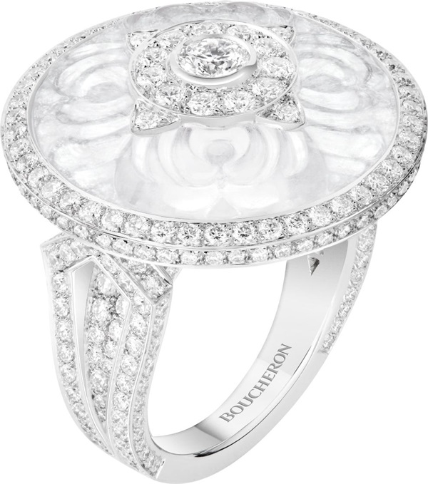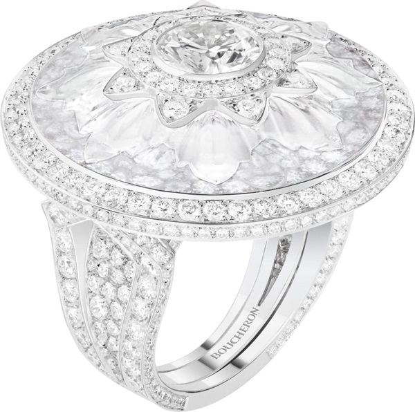 以纽扣元素为灵感原型,Boucheron宝诗龙还设计了一枚镶嵌一颗4.63克拉钻石(D VVS2)的磨砂水晶戒指,和一对长短可调节的吊坠耳环。