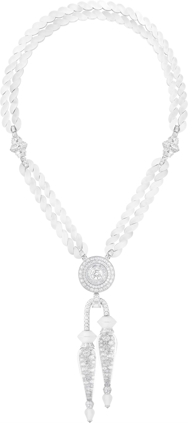 世家工坊以摩登美学重新诠释垂饰这一用于盛典礼服的编织装饰元素。焕新呈献的项链由白金材质、水晶和钻石编织而成,延续世家一饰多戴的设计理念,为佩戴者提供多样演绎方式:项链可拆分为两件胸针和一件磨砂水晶手镯,均可单独佩戴。这条项链采用经典的新装饰艺术风格(neo-Art Deco)造型,辅以独特的水晶切割方式,并镶嵌一颗2.11克拉圆钻(E VVS2)。该作品可拆卸为两件胸针,其中一件精妙复刻了传统垂饰的坠饰元素,项链的吊坠部分铺镶钻石并覆以水晶,绽放出愈加耀目的璀璨光辉。
