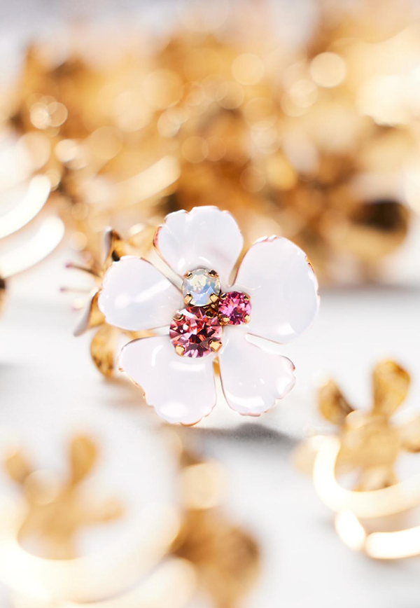 两朵金属花朵历经火烧工艺塑造成形。随后,戒指先经手工打磨抛光,再覆以金箔。在镶嵌白色和玫瑰色水晶后,最后再涂饰精美珐琅。在匠师的妙手点染之下,樱花绽放出绚丽色彩,朵朵栩栩如生。