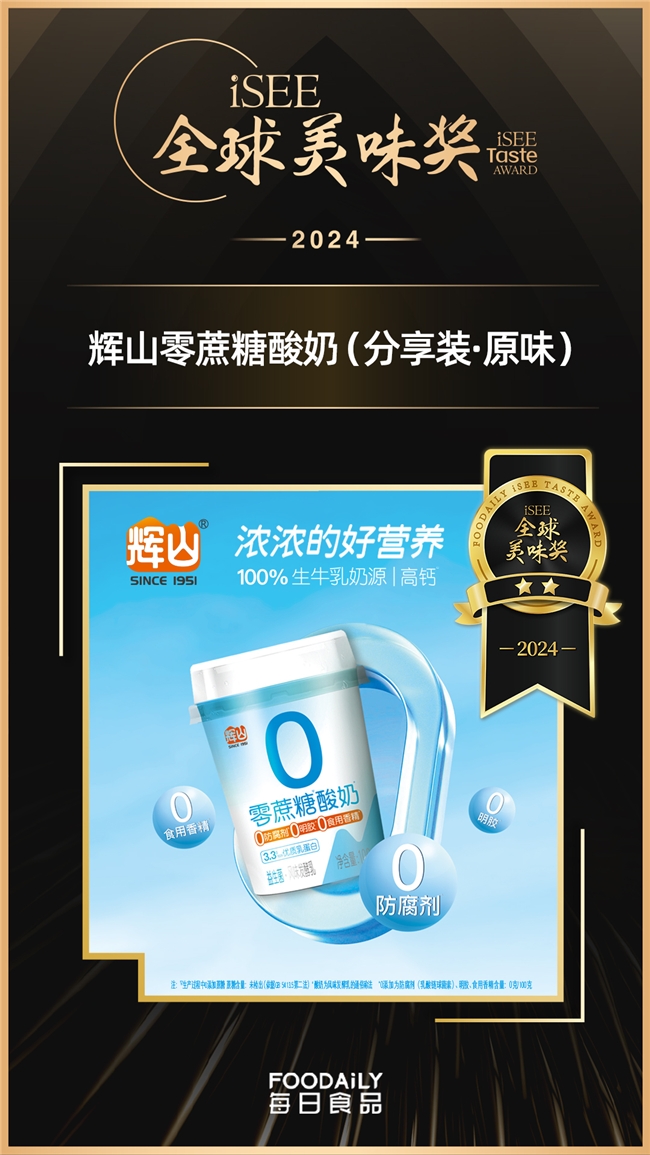 3月20日,食品饮料行业权威领先奖项iSEE全球美味奖公布,辉山零蔗糖酸奶(分享装·原味)从全球4000+参奖案例中脱颖而出,斩获iSEE全球美味奖2星奖章。