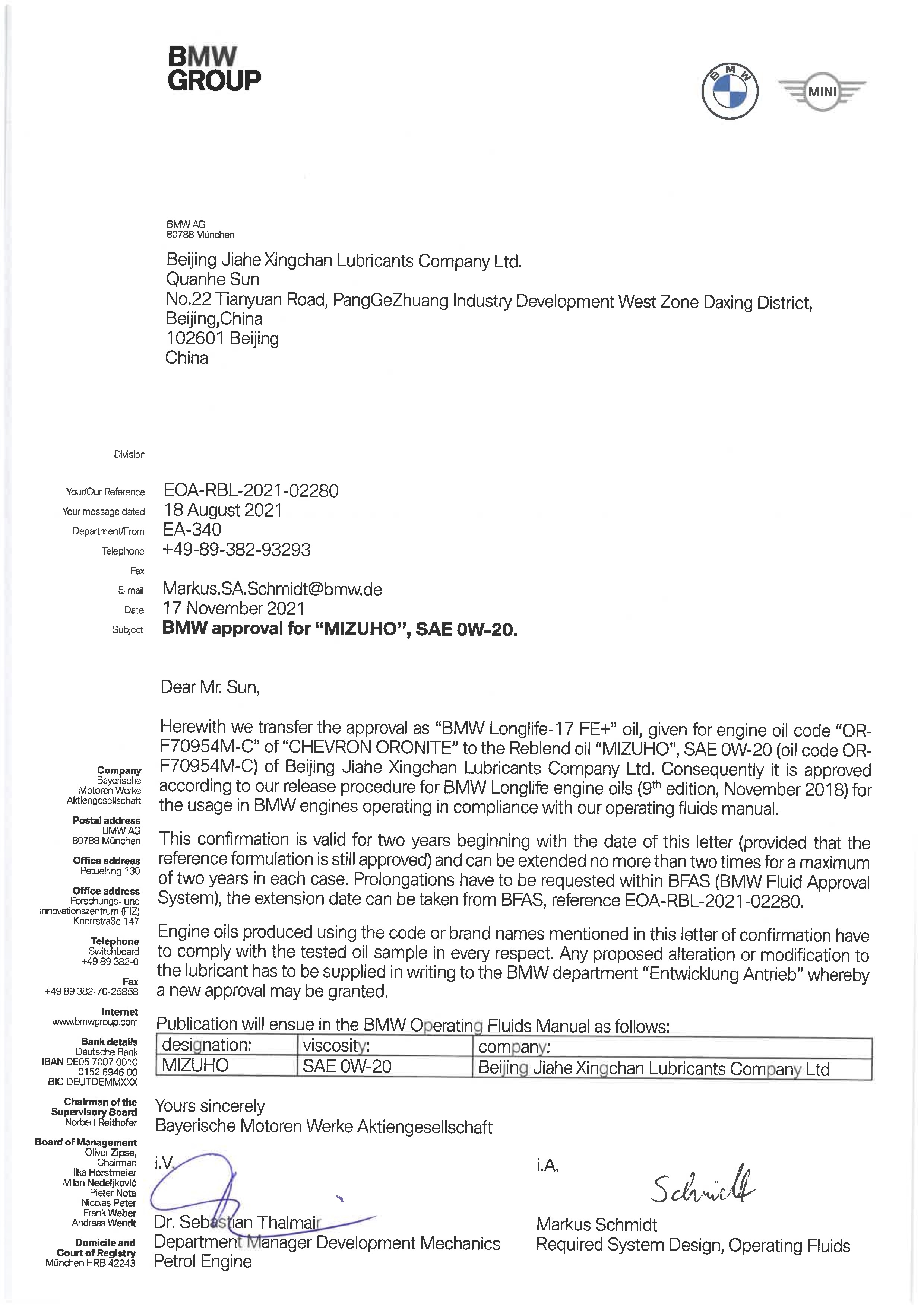 嘉禾兴产润滑油2021年通过了宝马 LongLife-17FE+标准认证
