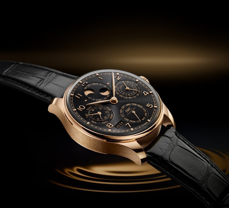 新作中尤为出众的改进是焕然一新的表壳结构。纤薄表圈搭配更为纤巧的表侧,表壳正面及表背均采用此新型表壳结构,令腕表尤为轻盈雅致。盒型蓝宝石玻璃透镜经精密复杂的铣削与抛光处理,使分钟刻度等葡萄牙系列标志性设计元素一览无遗。表盘图案亦经悉心改进与优化。表盘呈现非凡深邃感的关键在于15层透明漆面,漆面经精细打磨,再抛光至高光饰面。显示万年历信息的小表盘则铣削嵌入黄铜圆盘和漆面涂层。最后,将时标以手工方式逐一安装于表盘。表盘制作流程包含60道独立工序,其复杂程度极具挑战性。