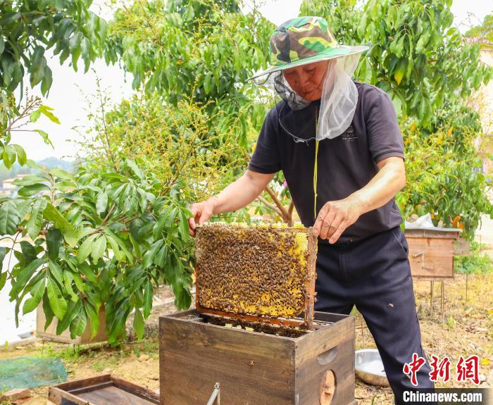 图为工人查看蜂箱的蜂蜜。张海斌 摄