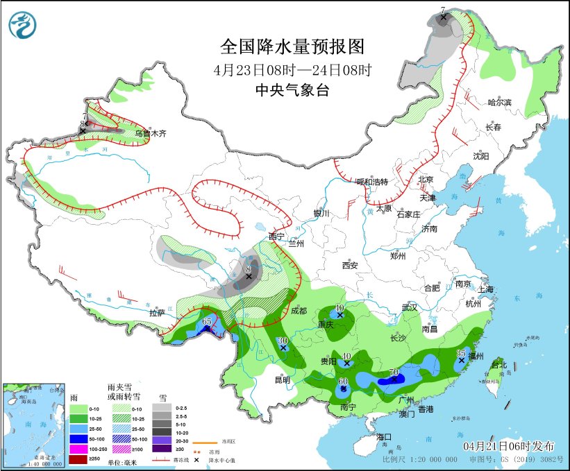 4月23日08时至24日08时,内蒙古东北部、黑龙江西北部、新疆伊犁河谷和南疆西部山区、西藏东部、青海南部和西部、川西高原等地部分地区有小到中雪或雨夹雪,局地有大雪(5~8毫米)。西藏东南部、四川南部、重庆中南部、贵州北部和东南部、云南北部以及江南南部、华南北部等地部分地区有中到大雨,其中,西藏东南部、广西中部和东部、广东西北部等地部分地区有暴雨(50~70毫米)。西藏南部和西部、内蒙古中东部、吉林西部、辽东半岛、陕西北部、河北北部、天津中部、山东半岛等地部分地区有4~5级风。