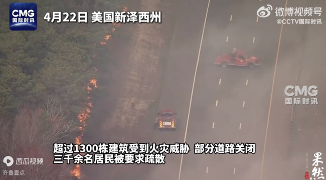 美新泽西州东部地区发生山火。当地时间4月22日下午,美国新泽西州东部地区发生山火。航拍镜头显示,森林中燃起熊熊大火,天空被浓烟遮蔽。新泽西州森林消防局当晚表示,目前此次山火过火面积约为13平方公里,火灾控制范围为5%,超过1300栋建筑受到火灾威胁,部分道路关闭,3000余名居民被要求疏散。目前尚未报告人员伤亡。