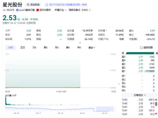 4月22日,星光股份(002076)开盘跌停,开于跌停价2.53元/股。