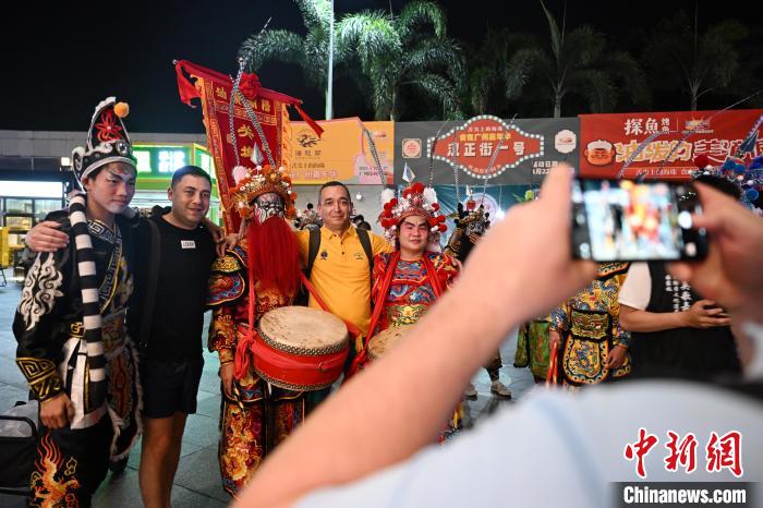 图为参加第137届广交会的境外采购商和英歌舞者合影。中新社记者 陈楚红 摄