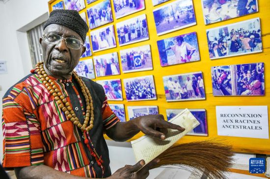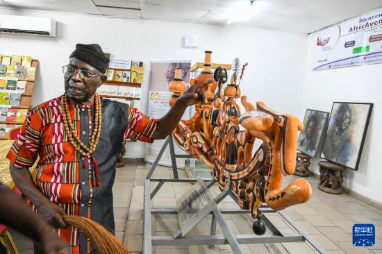 3月17日,在喀麦隆杜阿拉,喀麦隆著名作家亚历山大·库马·恩敦贝三世介绍喀麦隆传统艺术品。新华社发(科普索摄)