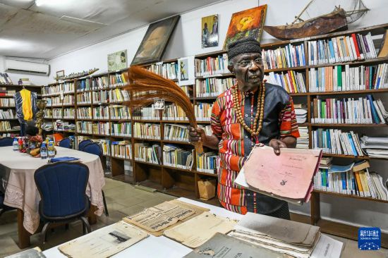 3月17日,在喀麦隆杜阿拉,喀麦隆著名作家亚历山大·库马·恩敦贝三世展示有关喀麦隆历史的档案文件。新华社发(科普索摄)