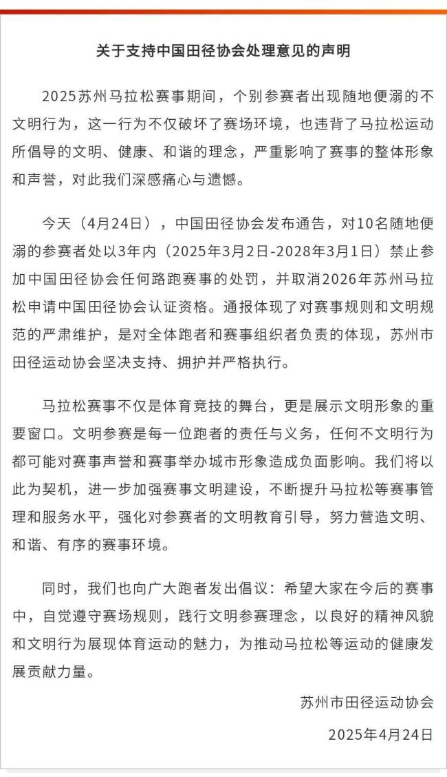 通报指出,2025苏州马拉松于3月2日在苏州市举办。比赛期间,个别参赛者出现不文明行为,暴露出参赛文明缺失,对中国马拉松形象造成严重负面影响。经中国田径协会研究,对陆某等10人处以3年内(2025年3月2日至2028年3月1日)禁止参加中国田径协会任何路跑赛事的处罚。同时,取消2026年苏州马拉松申请中国田径协会认证资格。