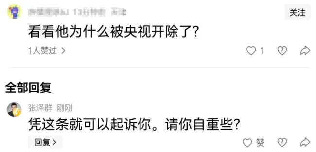 主持人张泽群否认被央视开除!近日,有网友称主持人张泽群被央视开除。4月25日,张泽群愤怒发文反驳,声明自己为中央广播电视总台主持人,并表示对此类污蔑言行保留法律权利。他还晒出了一张截图,显示有网民在评论区询问他为何被央视开除,张泽群回复说凭这条就可以起诉对方,并请对方自重。