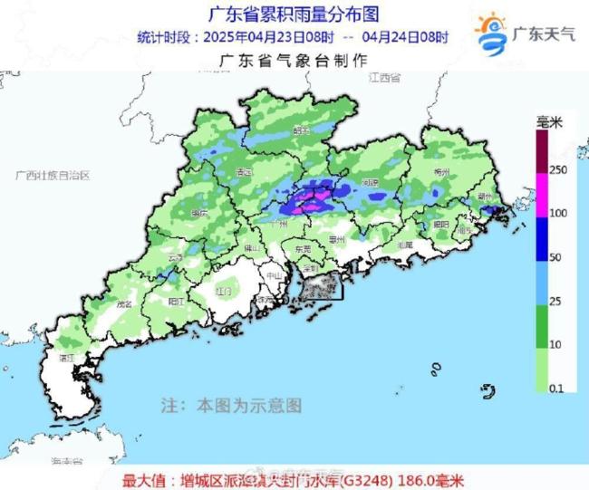 23日到24日早晨,珠三角北部出现了大到暴雨局部大暴雨,粤北和粤东部分市县出现了中到大雨局部暴雨,其余市县出现了分散雷阵雨。据统计,全省有13个镇街录得超过100毫米的大暴雨,41个镇街录得50至100毫米的暴雨。广州增城区派潭镇录得186毫米,潮州饶平县汫洲镇录得110.2毫米,韶关新丰县丰城街道录得102.1毫米。
