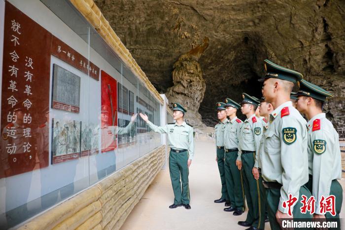 中新网河池4月27日电(奎子清 王安安 温智浩)在五四青年节即将来临之际,近日,武警广西总队河池支队官兵走进位于广西河池市东兰县的广西农民运动讲习所旧址列宁岩,开展五四青年节主题团日活动。官兵们通过入团宣誓、聆听红色故事、参观革命旧址等形式,在红色历史中感悟初心使命,以青春誓言续写强军篇章。