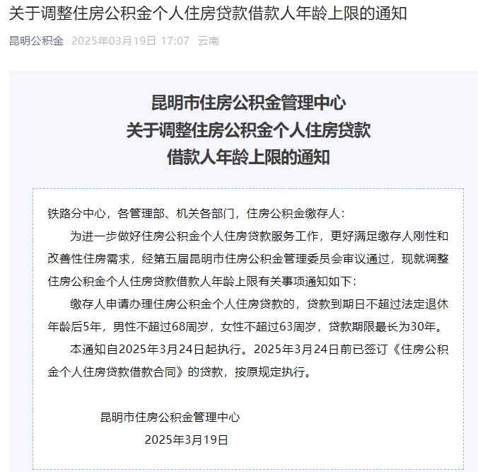 2025年3月19日,昆明发布《关于调整住房公积金个人住房贷款借款人年龄上限的通知》。