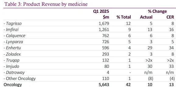 肿瘤领域,最畅销的Tagrisso(奥希替尼)单季度销售额达16.79亿美元(+8%);Imfinzi(度伐利尤单抗)、Lynparza(奥拉帕利)、Calquence(阿可替尼)、Enhertu(德曲妥珠单抗)也均在增长之中;其中叠加第一三共负责的地区销售额,Enhertu在2025Q1的全球销售额为10.86亿美元。