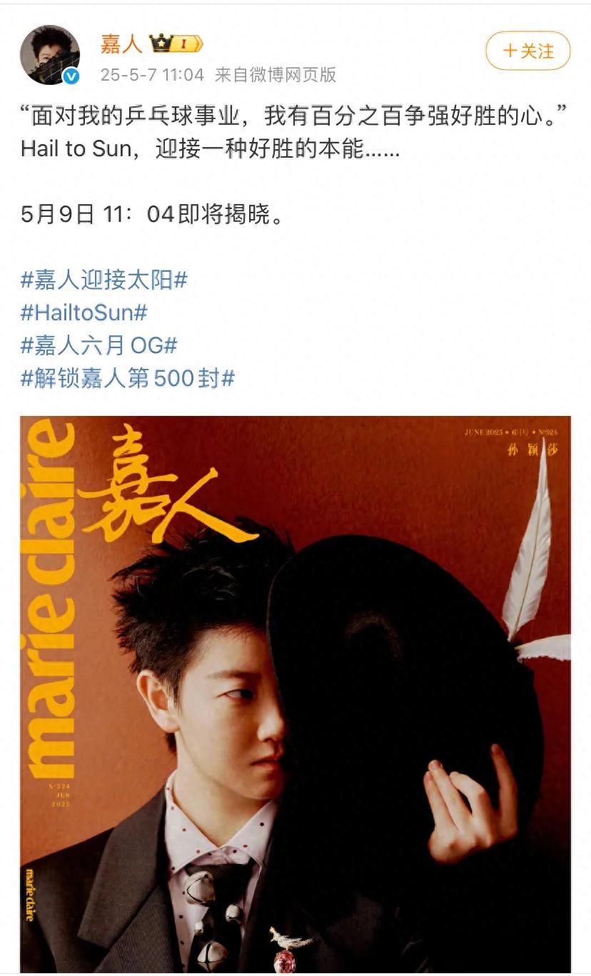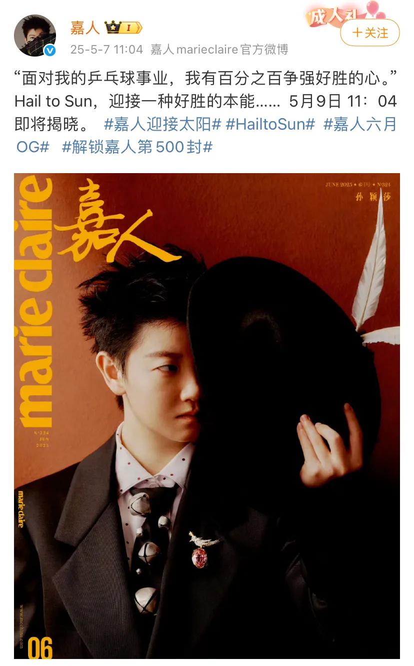 北京时间5月7日,嘉人官方发布了6月刊封面,封面是孙颖莎,超级帅气的孙颖莎。