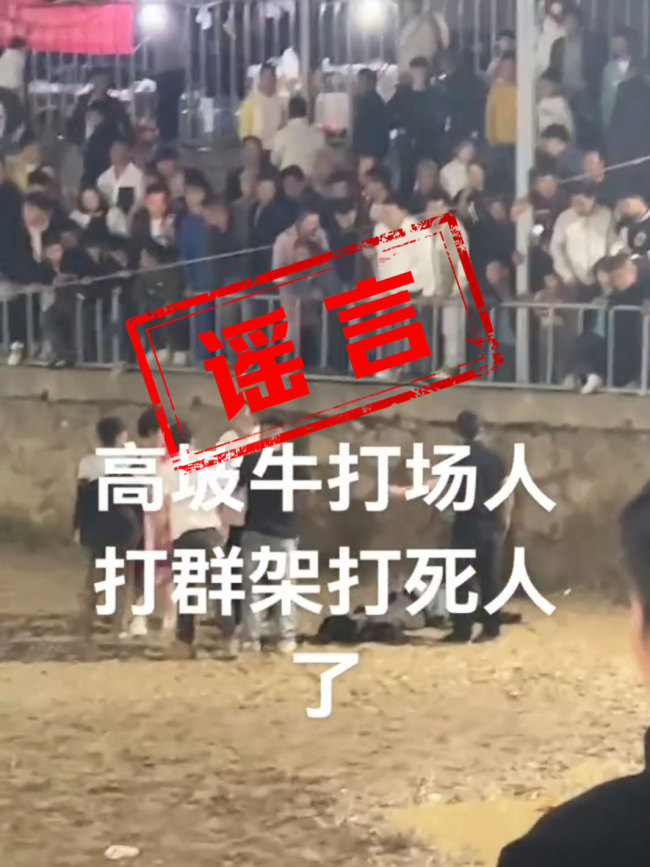 官方辟谣斗牛比赛现场冲突致人死亡 伤者无生命危险。5月6日,一段关于贵州省贵阳市花溪区高坡乡斗牛比赛现场发生冲突致人死亡的视频在网络上流传,引起广泛关注。次日,赛事主办方和当地政府回应称,现场确实发生了冲突,有人受伤倒地,但无生命危险,网传死亡消息不实。