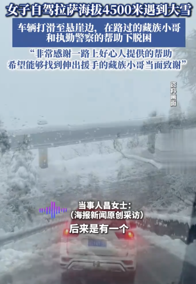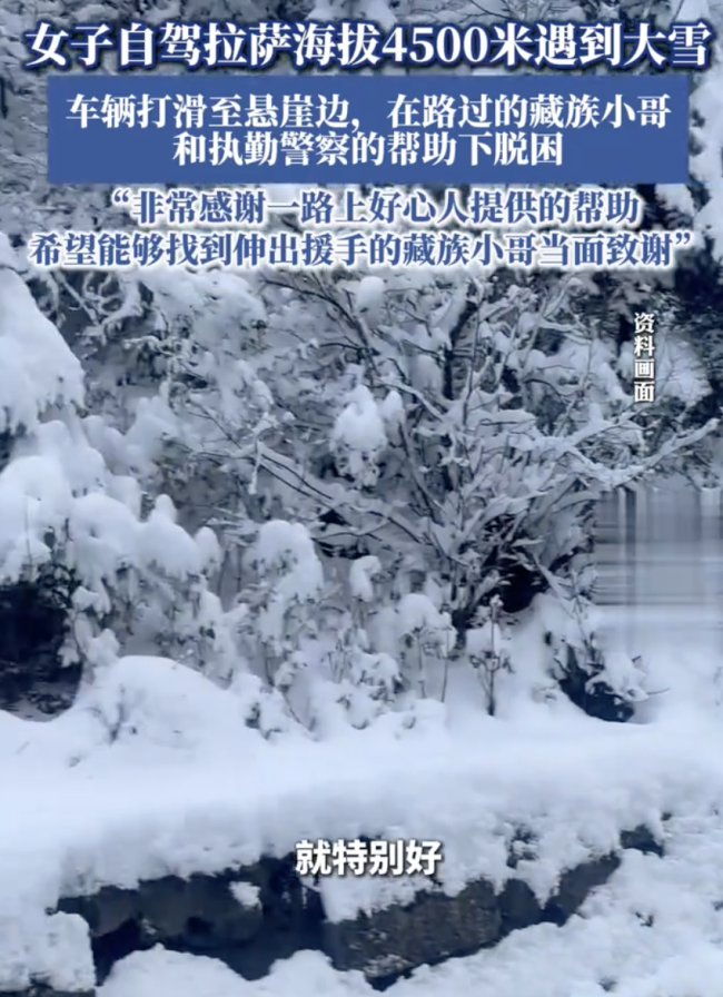女子自驾拉萨车辆打滑至悬崖边。女子自驾拉萨(海拔4500米)时因大雪导致车辆打滑至悬崖边,在藏族小哥和执勤警察的帮助下脱困。女子自驾拉萨车辆打滑至悬崖边女子自驾拉萨车辆打滑至悬崖边女子自驾拉萨车辆打滑至悬崖边