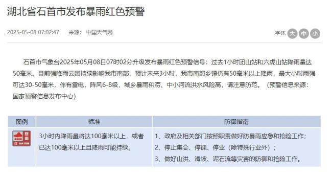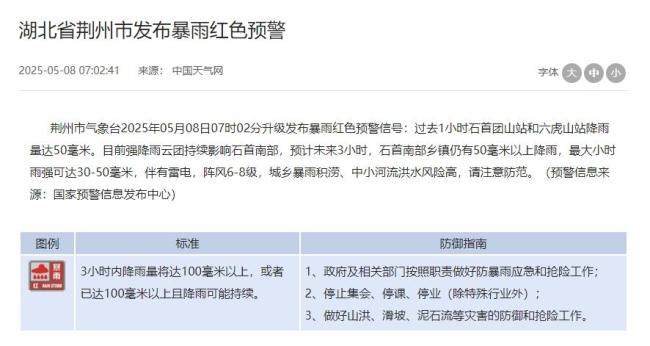 昨夜今晨,荆州地区连续发布暴雨预警信号,从黄色升级到橙色,最终于5月8日7时2分,荆州市气象台和石首市气象台将预警信号升级为红色。截至5月8日08时的24小时内,荆州市出现了大范围的大到暴雨天气,其中石首、监利、洪湖等地降水尤为明显。