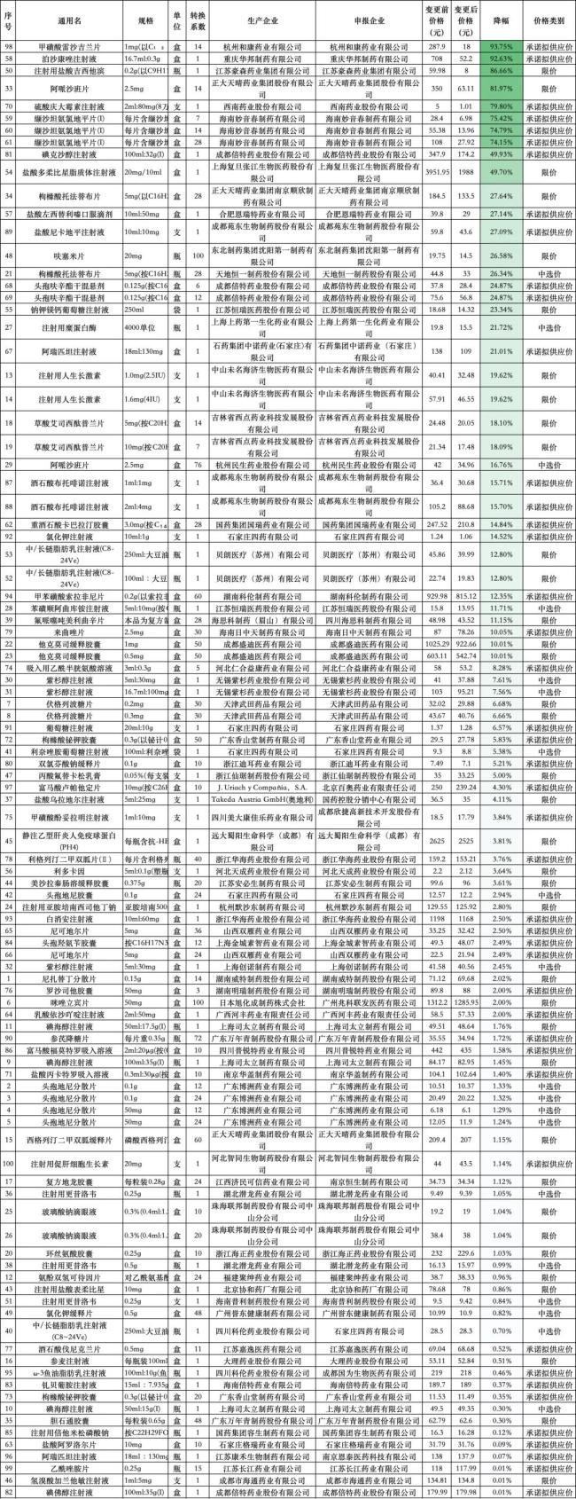 河南发布此批公示名单中包括100个药品(名单及企业、价格等见文末附2),涉及紫杉醇注射液、头孢地尼分散片、注射用更昔洛韦等品种,整体平均降幅约14%,其中,降幅最高超过93%,为一款甲磺酸雷沙吉兰片,价格由287.9元按承诺拟供应价降至18元。