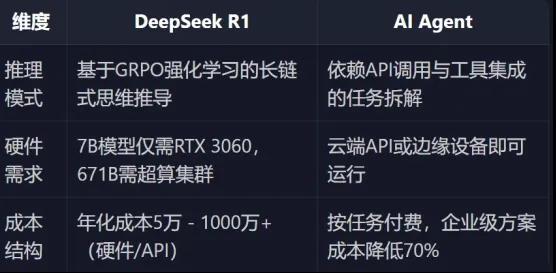 举个简单的应用案例:如果你让DeepSeek调研一个产业并生成含有详细数据的报告,基本上只能得到一篇长文本;但如果使用Agent,它能生成一份带有详细文字和复杂图表(如饼状图、曲线图)的综合报告,并且能够保存为HTML或PDF文件。另外,两者在硬件要求、成本结构等方面也有所不同,具体入下表: