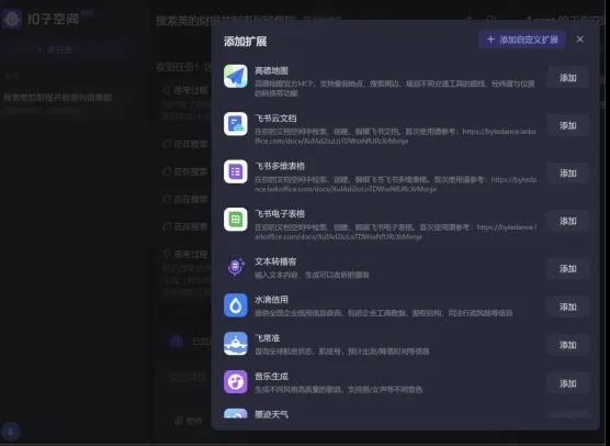 字节的“扣子空间”使用豆包1.5Pro为主的多款模型,目前处于内测期,需要申请排队才能使用。它的定位更像是“全技能实习生”,可以做PPT、生成行业报告等,亮点是接入了不少主流MCP工具,比如飞书、高德地图和Github等,对于互联网打工人来说很友好。