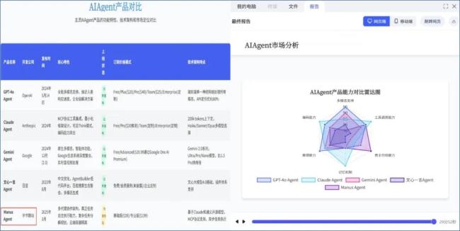 心流方面,在高级研究的模式下,耗时29分52秒完成了任务,其浏览的数据明显更多,所以处理时间较长。贴心的是,在完成任务后心流会通过邮件通知使用者。心流生成的报告非常详细且图文并茂,使用曲线、六维图来丰富报告内容,支持HTML下载,PDF功能暂时为开放。然而,心流对“通用Agent”的理解完全错误,罗列了GPT-4o等主流大模型AI应用,还错误地将Manus的开发公司写成了字节跳动,报告的实际价值大幅降低。